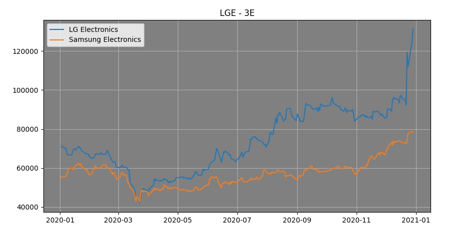요즘 주식이 매우매우 상승세를 타고있는 LG전자와 삼성전자의 일봉을 가져와서 표시해봅시다.
